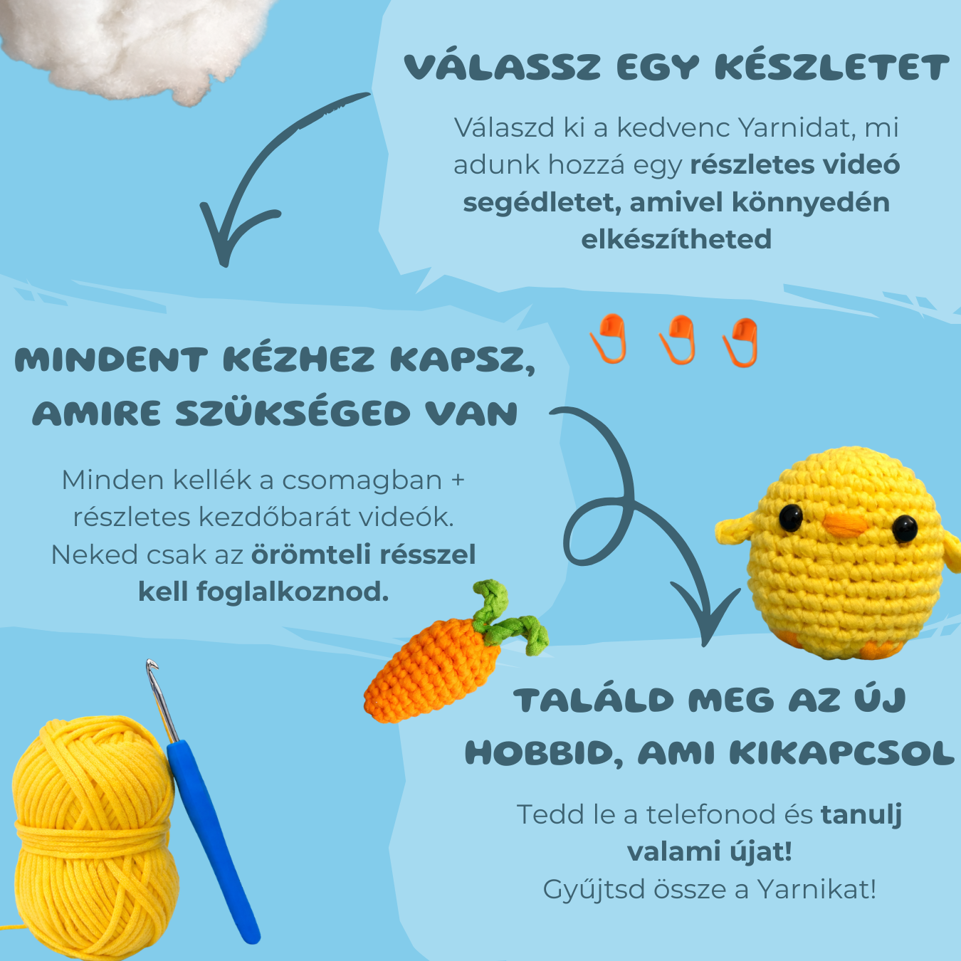 Alkosd meg a Yarnikat lépésről lépésre, még akkor is, ha most próbálod először a horgolást. A készlet segít, hogy gyors sikerélményed legyen, miközben kreatívan kapcsolódsz ki.